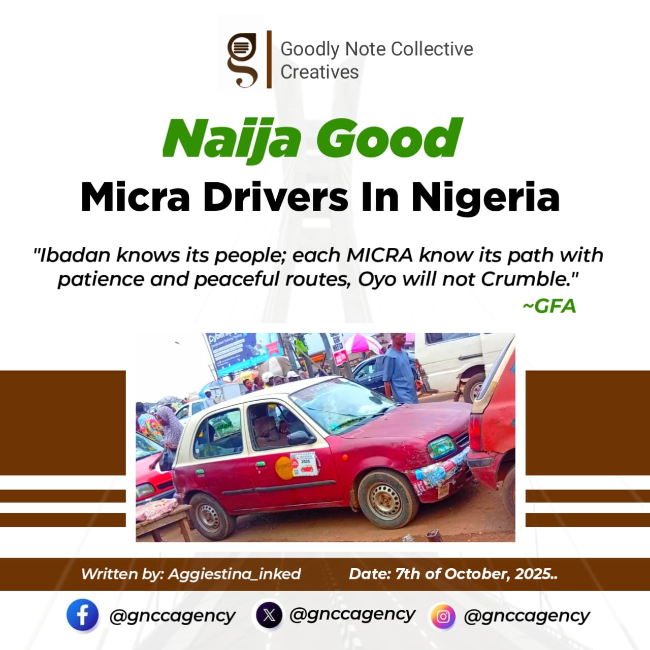 Welcome to Ibadan! The city full of the four legged cream and brown Nissan wheels, popularly called Micra. This episode of NAIJA GOOD is not about the wheels but about the men behind the wheel, Micra Drivers.
